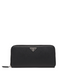 A curved-edged Saffiano leather wallet containing 1 bill compartment with zipper, 12 credit card slots, 6 document pockets and 1 coin compartment with zipper. The piece is finished with the Prada logo and zipper closure.